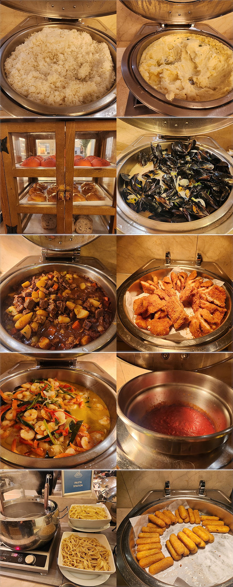 There is rice, mussel dishes, beef stew, shrimp dishes, and a pasta-making station.