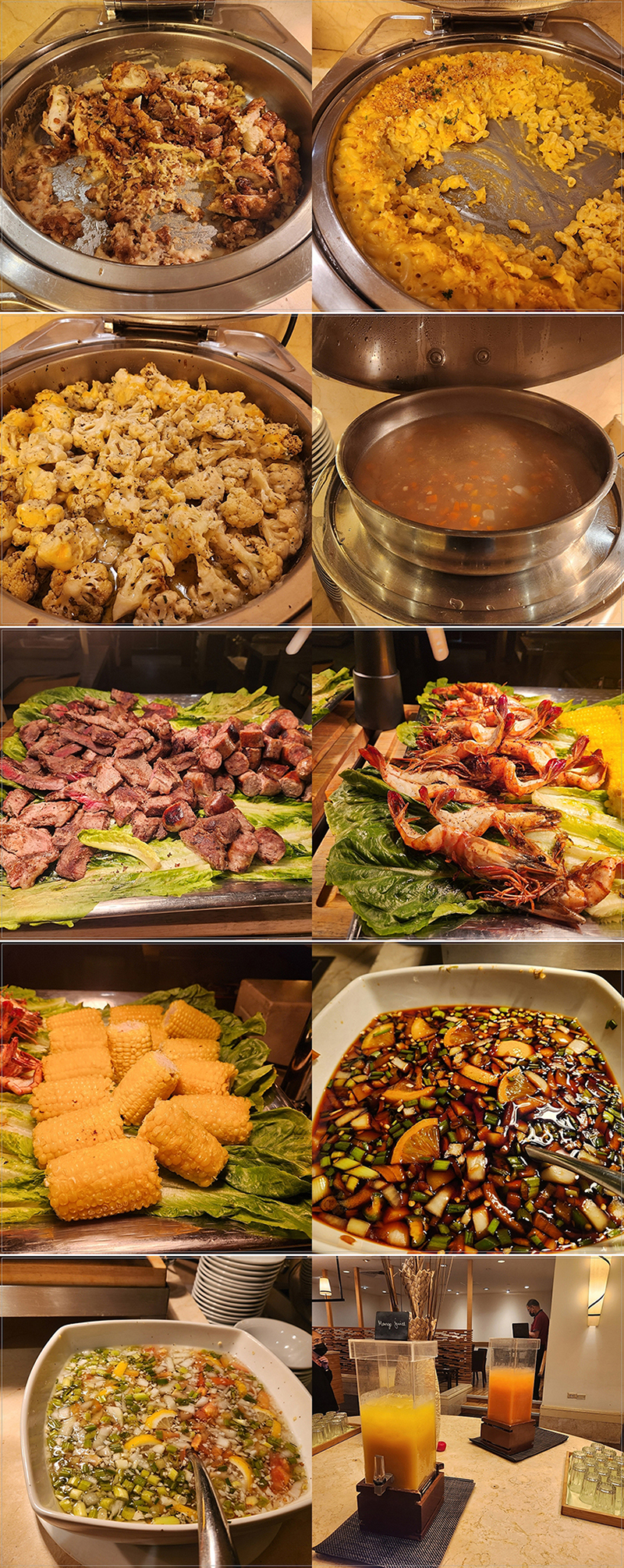 The main menu includes macaroni & cheese, broccoli, vegetable soup, grilled steak and shrimp, corn, juice, and various sauces.