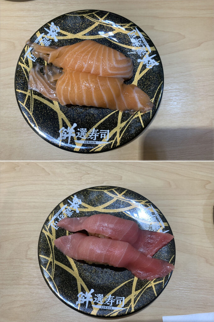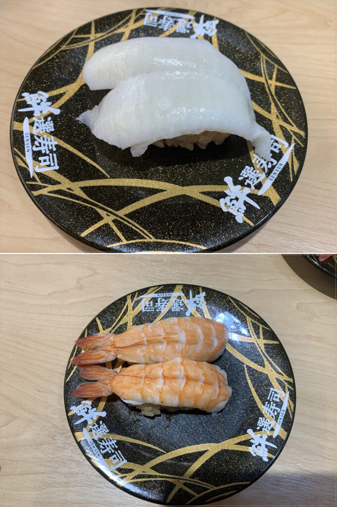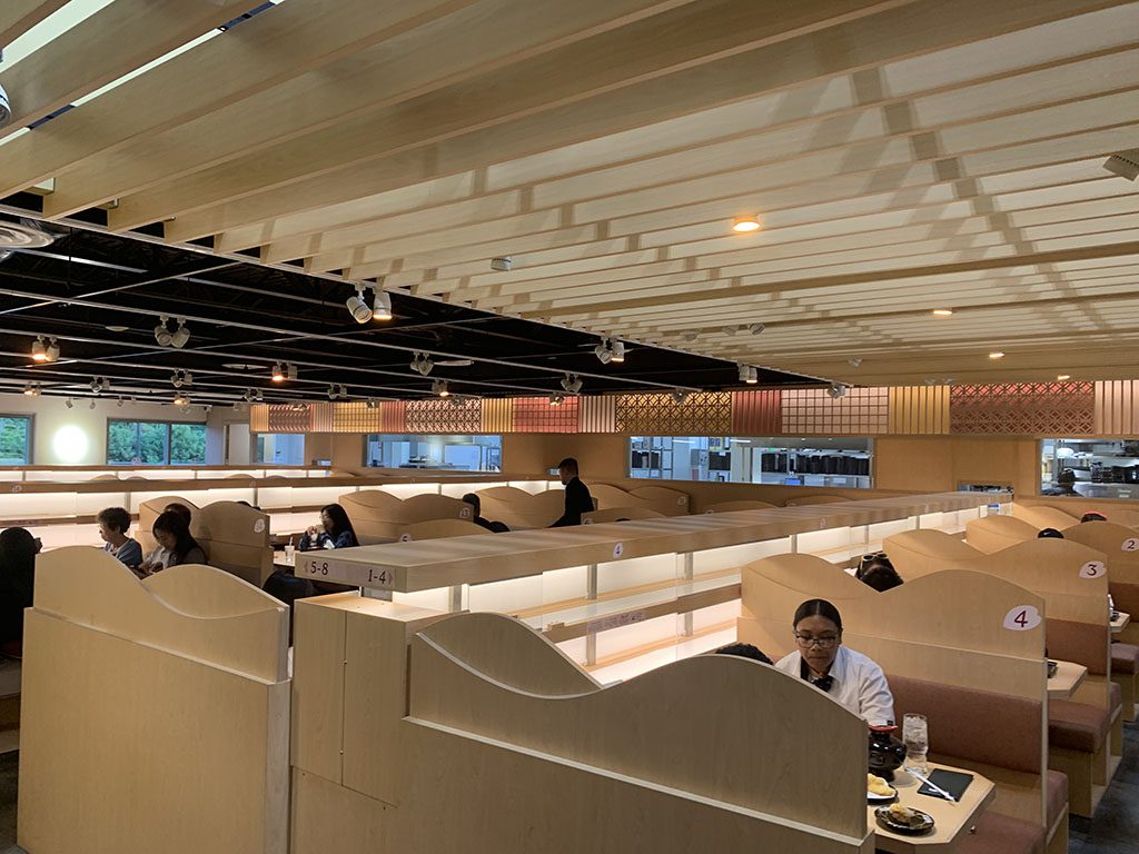 The layout is similar to a conveyor belt sushi restaurant, but the table is equipped with chopsticks, soy sauce, and ginger, while wasabi is brought separately.