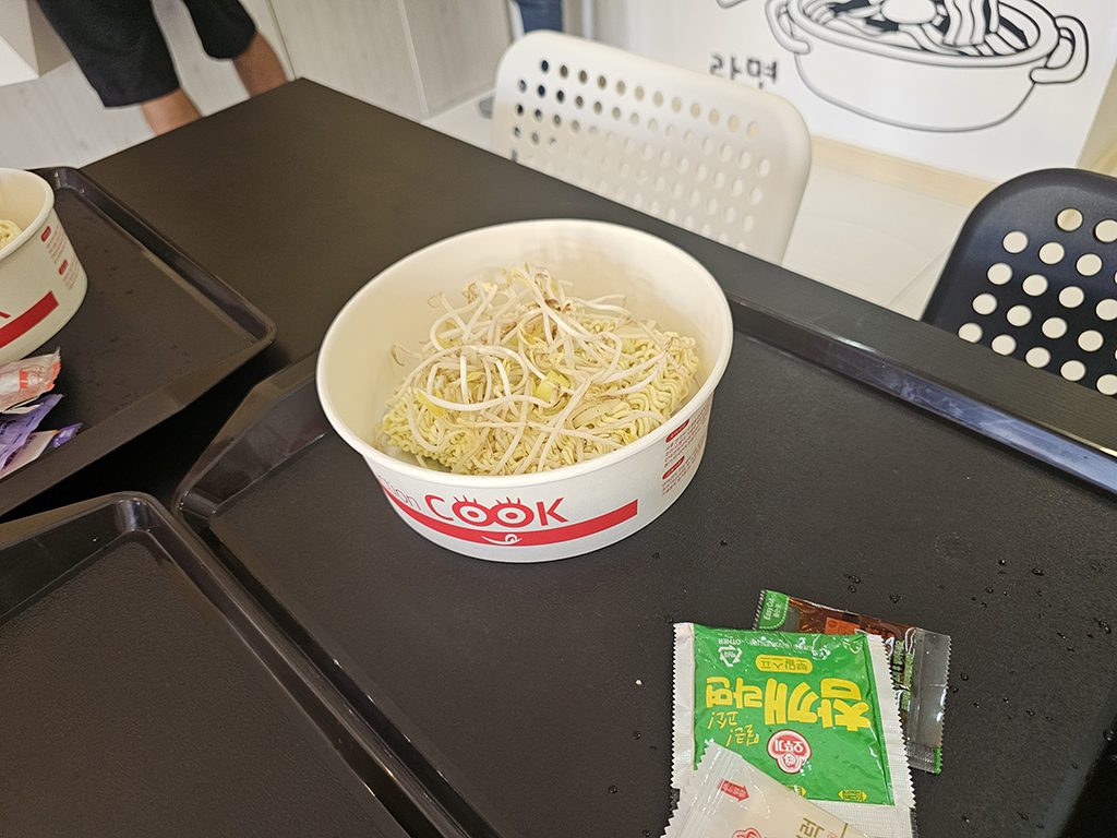 一体どうすればいいのか戸惑う方も多いかと思いますが調理器の使い方の説明書きもあり、お店の人も丁寧にサポートしてくれるので安心。まず好みの袋麺を紙製容器に入れ、無料のもやしとネギは好きなだけトッピング。