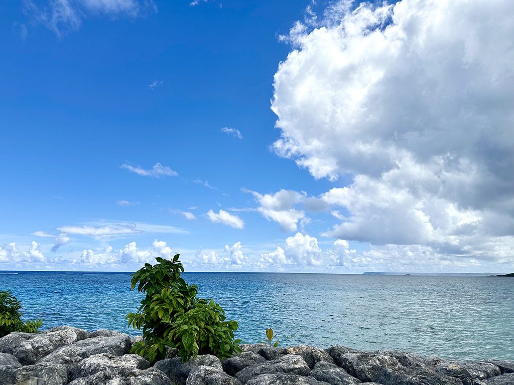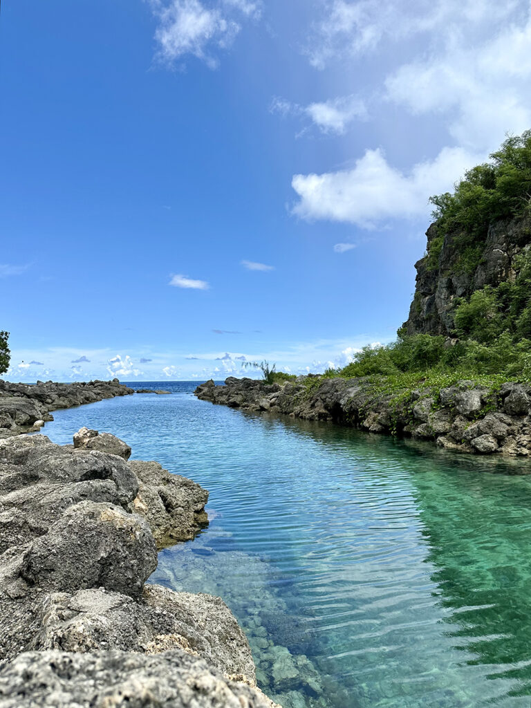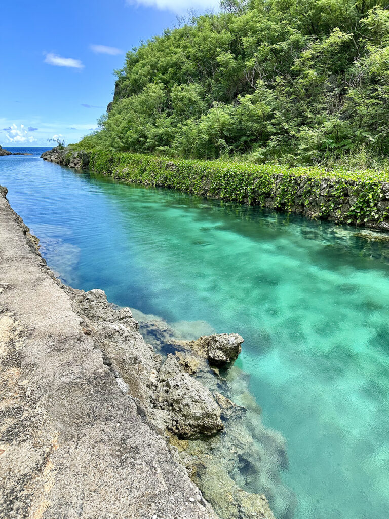이 아름다운 색이 에메랄드 밸리라는 이름을 가지게 된 이유입니다. 하지만 ‘밸리(Valley)’라는 이름이 붙었어도 실제로는 협곡이나 계곡이 아닙니다. 아프라 항구로 이어지는 이 길게 뻗은 육지는 전쟁 전에는 괌 섬에서 떨어진 섬이었다고 합니다. 전후에 괌 섬과 도로로 연결되었고, 그 연결 부분의 수로 같은 부분이 바로 이 에메랄드 밸리입니다. 아름다운 이 수로를 따라 몇십 미터 걸어가면 그 끝은 바다로 이어집니다.