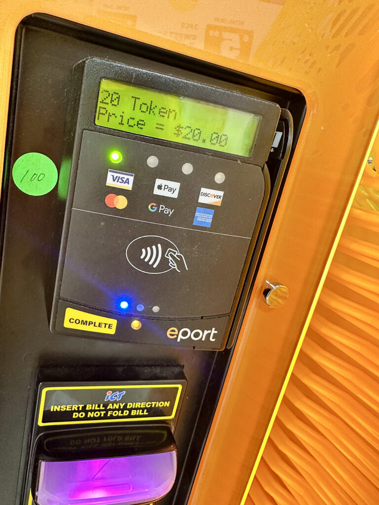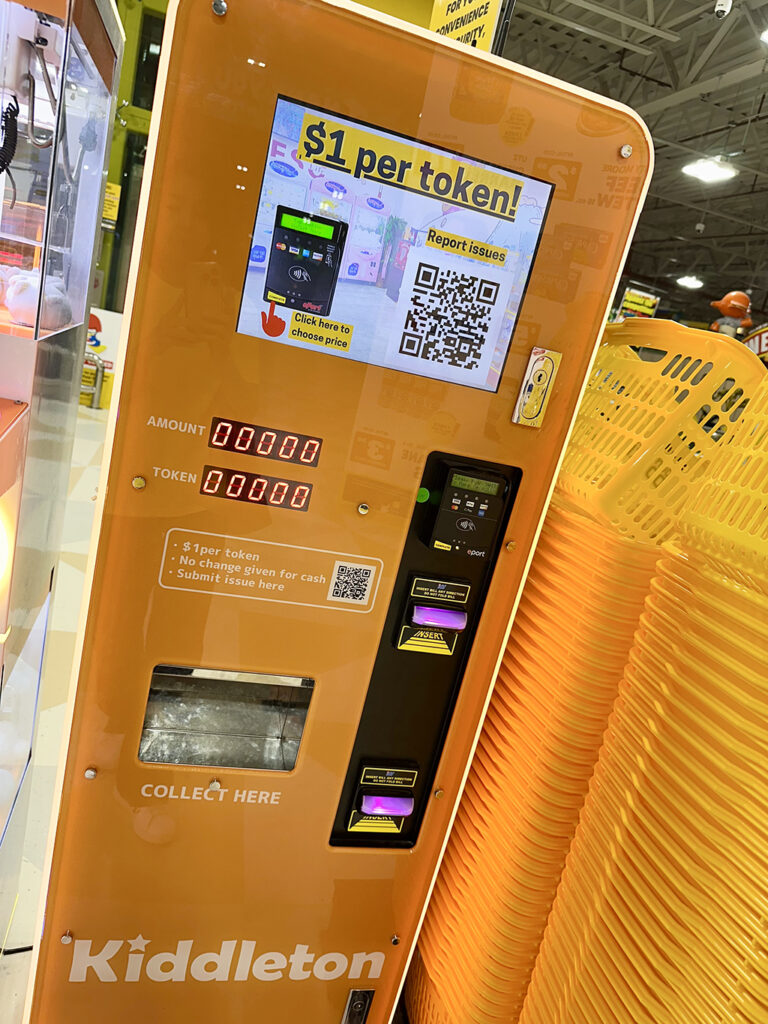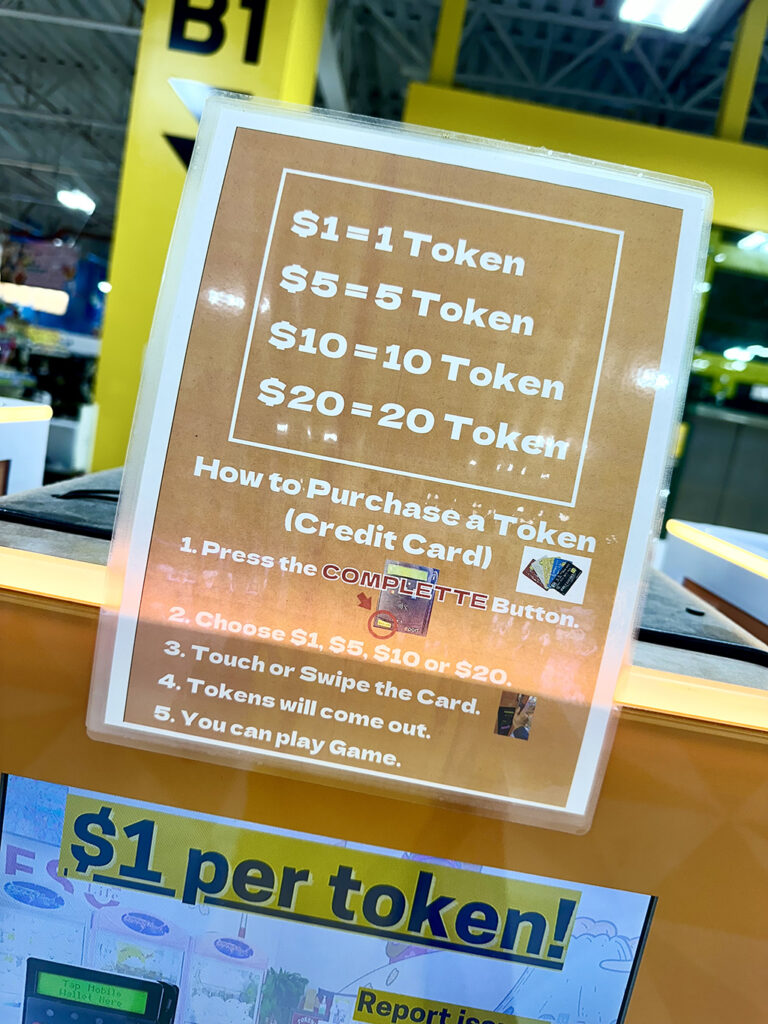 無論是扭蛋還是夾娃娃機,首先都需要購買專用的代幣(Token)。上面的照片就是代幣販賣機。代幣一枚1美元。使用現金時,投入對應數量的金額即可。