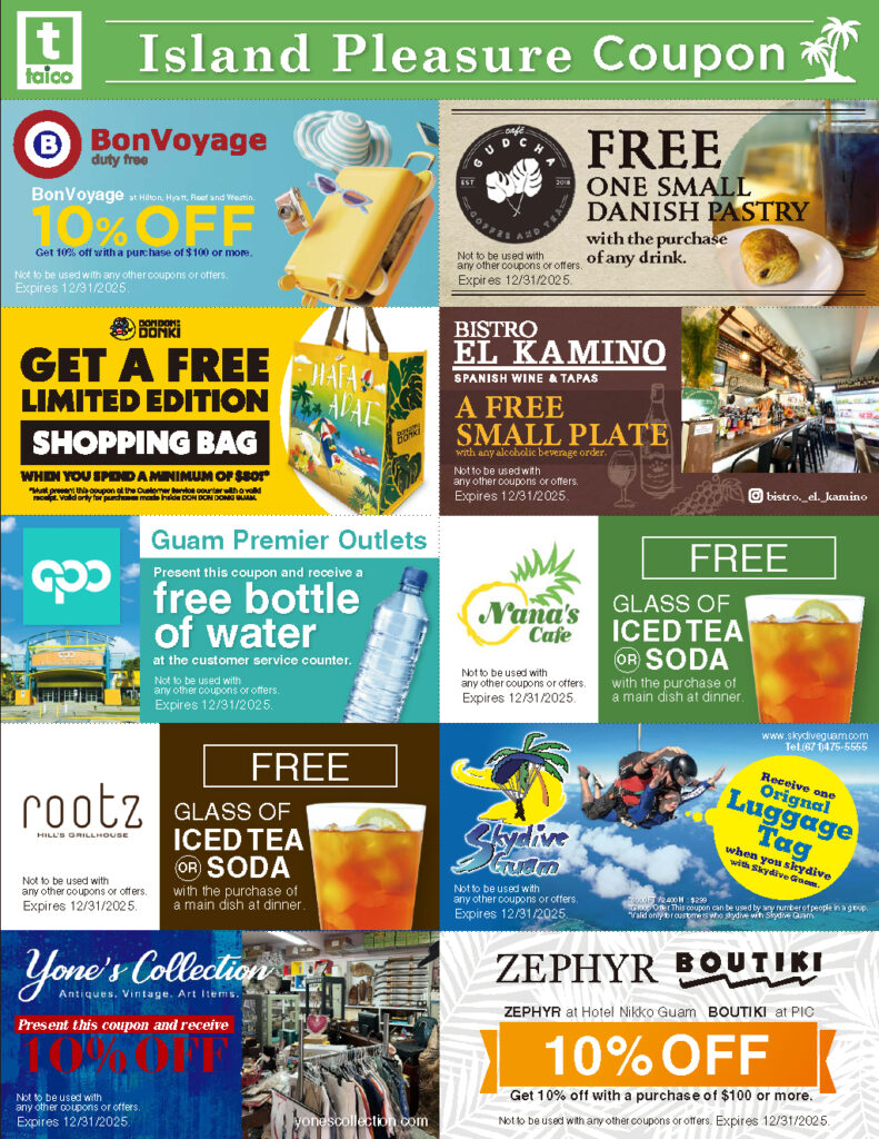 優惠券精選了關島的餐廳、咖啡廳、免稅店,甚至還有跳傘等共計10個地方使用。